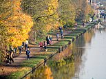 Joggers and walkers are seen running along a path by Bridgewater Canal in Manchester this morning. City centres have been left deserted across England on the first weekend of national lockdown, but beauty spots have stayed busy
