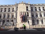 At the Cenotaph, around 10,000 veterans would normally pay their respects, but this year there are just 26 because of the risks presented by Covid-19. Pictured: The veterans today
