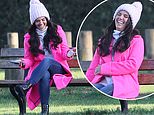 She kept out the cold with a cosy looking light-pink beanie hat and her dark locks were styled to perfection in loose curls.