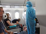 Under a new ‘test to release’ scheme, people flying from high-risk destinations will be able to get a private test after five days in self-isolation. Pictured: An flight attendant prepares to conduct the safety briefing for passengers while wearing PPE