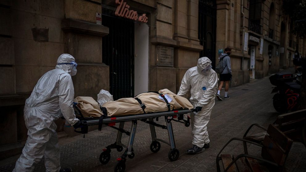 BARCELONA, Spain — When Marina Gómez and her fellow mortuary worker enter a room at a nursing home to remove the body of a COVID-19 victim, they work methodically and in silence.