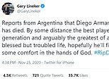Gary Lineker pays tribute to Diego Maradona after star’s death aged 60