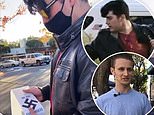 A California man, 19, has been arrested after being caught sticking Nazi stickers around town by a 21-year-old resident who confronted him on camera. Pictured the suspect