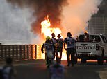 Romain Grosjean’s car explodes into a fireball after 140mph crash that split his car in HALF… but he miraculously walks away with burns and broken ribs before being airlifted to hospital