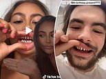 Dentists have taken to TikTok to blast the trend of shaving teeth to pegs for crowns, revealing the surgery causes lasting damage to teeth. Pictured: An influencer sharing her before and after