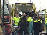 Two people have been taken to hospital in ambulances after they were stabbed in The Hague, while the suspect fled the scene, leading the police on a manhunt. Pictured: Images from a local news station show emergency crew loading a person into an ambulance as police and firefighters work at the scene