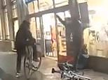 Dash camera footage shows the three thugs on bicycles approach the defenceless man sitting in a sleeping bag outside the shop.