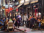 People enjoy an outdoor meal at a pub in London’s Soho last night on the last day of Tier Two