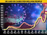 Britain’s infection rate, in yellow, has rebounded sharply since the end of a national lockdown at the start of December – a resurgence blamed on the new variant of Covid-19 which has left the UK isolated by a series of travel bans. The US infection rate is still higher than in Britain, with some scientists and politicians saying America should also stop flights from the UK