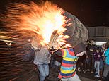 They are then set alight on the night of the event outside a series of pubs and are hoisted on to people’s backs and shoulders when fully ablaze.