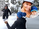 Former Olympic ski champion Julia Mancuso, from California, shared a clip of herself throwing her young son, Sonny, one, (pictured with his mother) into deep snow