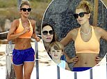 The star showcased her taut midriff in a bright orange crop-top paired with navy shorts that displayed her honed legs as she ran down the beach with a pal.
