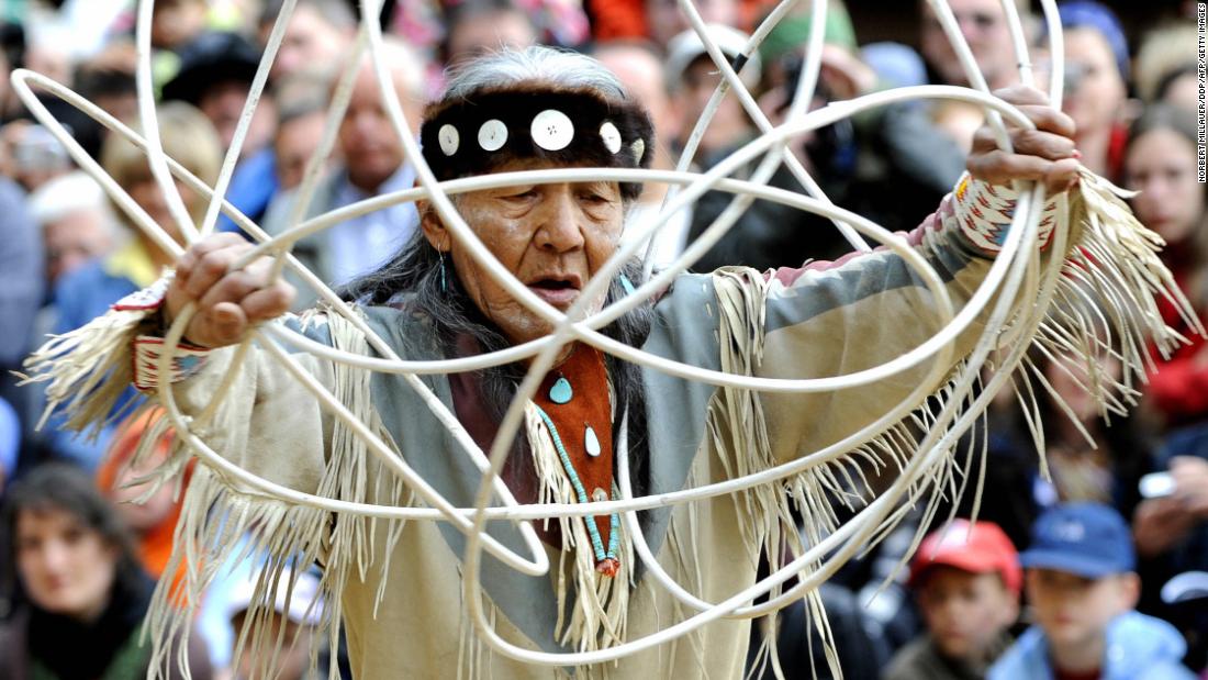 Navajo elder Jones Benally performs a traditional hoop dance at a festival in Germany in 2008.