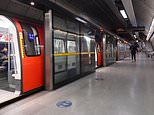A handful of people are seen on the platform and on a Jubilee line train at Southwark station in Central London today