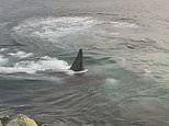 A great escape! Seal leaps onto rocks to avoid being hunted down by pod of killer whales