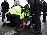 Protesters yelled as they were surrounded and arrested after officers asked them to leave area around Parliament Square. One was pinned down and cuffed on the plinth under the statue of Mahatma Gandhi