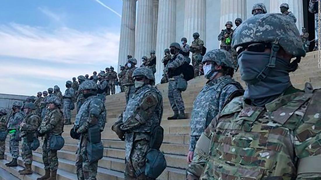Members of the DC National Guard, armed and wearing camouflage uniforms, stood on the steps of the Lincoln Memorial last June, as crowds of demonstrators held a peaceful protest following several days of demonstrations.