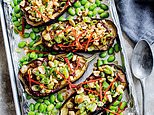Sprinkle the spring onions and peanuts over the top and scatter the frozen edamame on the tray around the aubergines.