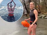 The cold water swimmer, who was wearing just a swimsuit as she dove into the lake, said she often travels to snow covered areas to access cooler water, adding: ‘A lot of swimmers love it when the ice comes, and will travel higher up to the mountains, frozen over and will smash through the ice to swim there.’