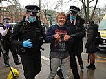 A protester is removed, by police officers, from the encampment in Euston Square Gardens in central London
