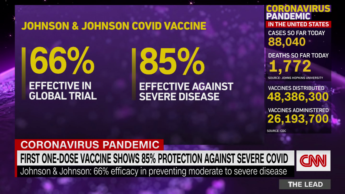 ‘);if (Modernizr && !Modernizr.phone) {$owlFirstItem.find(‘.media__icon’).hide();}}CNN.Videx.Metadata.init({dateCreated: videocardContents.dateCreated,descriptionText: videocardContents.descriptionText,duration: videocardContents.duration,sourceLink: videocardContents.sourceLink,sourceName: videocardContents.sourceName,title: videocardContents.headlineText},{videoCollectionDivId: ‘cn-119g77z’,videoDescriptionDivId: ‘js-video_description-119g77z’,videoDurationDivId: ‘js-video_duration-119g77z’,videoTitleDivId: ‘js-leaf-video_headline-119g77z’,videoSourceDivId: ‘js-video_sourceName-119g77z’});if (CNN.Utils.exists(videocardContents.showName)) {if (CNN.Utils.exists(videocardContents.showUrl)) {showDetailsSpanContent = ‘‘ + videocardContents.showName + ‘ | ‘;} else {showDetailsSpanContent = videocardContents.showName + ‘ | ‘;}}fastdom.measure(function getShowInfo() {var $show = jQuery(‘.metadata__show’),$isShowDetailsSpanExists = $show.find(‘span’).hasClass(‘metadata–show__name’),$showName = jQuery(‘.metadata–show__name’);fastdom.mutate(function updateShowInfo() {if (!$isShowDetailsSpanExists) {$show.prepend(‘‘ + showDetailsSpanContent + ‘‘);} else {$showName.html(showDetailsSpanContent);}});});if (typeof (history) !== ‘undefined’ && typeof (history.replaceState) !== ‘undefined’) {history.replaceState(”, ”, videocardContents.url);document.title = videocardContents.headlineText ? videocardContents.headlineText : ”;}}function getCurrentVideoCardContents(currentVideoId) {var containerContents = [{“branding”:””,”cardContents”:{“additionalSections”:[],”auxiliaryText”:””,”bannerText”:[],”bannerHasATag”:false,”bannerPosition”:””,”brandingLink”:””,”brandingImageUrl”:””,”brandingTextHead”:””,”brandingTextSub”:””,”cardSectionName”:””,”contentType”:””,”cta”:”share”,”descriptionText”:[“CNN’s Athena Jones reports. “],”descriptionPlainText”:”CNN’s Athena Jones reports.”,”headlinePostText”:””,”headlinePreText”:””,”headlineText”:”The first one-dose covid vaccine, made by Johnson & Johnson, shows 85% protection against severe covid “,”headlinePlainText”:”The first one-dose covid vaccine, made by Johnson & Johnson, shows 85% protection against severe covid “,”iconImageUrl”:””,”iconType”:”video”,”isMobileBannerText”:false,”kickerText”:””,”maximizedBannerSize”:[],”media”:{“contentType”:”image”,”type”:”element”,”cutFormat”:”16:9″,”elementContents”:{“caption”:”Lead Athena Jones DNT Live Jake Tapper _00001930.png”,”imageAlt”:”Lead Athena Jones DNT Live Jake Tapper _00001930″,”imageUrl”:”//cdn.cnn.com/cnnnext/dam/assets/210129162749-lead-athena-jones-dnt-live-jake-tapper-00001930-large-169.png”,”label”:””,”galleryTitle”:””,”head”:””,”source”:””,”photographer”:””,”cuts”:{“mini”:{“width”:220,”type”:”jpg”,”uri”:”//cdn.cnn.com/cnnnext/dam/assets/210129162749-lead-athena-jones-dnt-live-jake-tapper-00001930-small-169.png”,”height”:124},”xsmall”:{“width”:307,”type”:”jpg”,”uri”:”//cdn.cnn.com/cnnnext/dam/assets/210129162749-lead-athena-jones-dnt-live-jake-tapper-00001930-medium-plus-169.png”,”height”:173},”small”:{“width”:460,”type”:”jpg”,”uri”:”//cdn.cnn.com/cnnnext/dam/assets/210129162749-lead-athena-jones-dnt-live-jake-tapper-00001930-large-169.png”,”height”:259},”medium”:{“width”:780,”type”:”jpg”,”uri”:”//cdn.cnn.com/cnnnext/dam/assets/210129162749-lead-athena-jones-dnt-live-jake-tapper-00001930-exlarge-169.png”,”height”:438},”large”:{“width”:1100,”type”:”jpg”,”uri”:”//cdn.cnn.com/cnnnext/dam/assets/210129162749-lead-athena-jones-dnt-live-jake-tapper-00001930-super-169.png”,”height”:619},”full16x9″:{“width”:1600,”type”:”jpg”,”uri”:”//cdn.cnn.com/cnnnext/dam/assets/210129162749-lead-athena-jones-dnt-live-jake-tapper-00001930-full-169.png”,”height”:900},”mini1x1″:{“width”:120,”type”:”jpg”,”uri”:”//cdn.cnn.com/cnnnext/dam/assets/210129162749-lead-athena-jones-dnt-live-jake-tapper-00001930-small-11.png”,”height”:120}},”responsiveImage”:true,”originalImageUrl”:”//cdn.cnn.com/cnnnext/dam/assets/210129162749-lead-athena-jones-dnt-live-jake-tapper-00001930.png”}},”noFollow”:false,”overMediaText”:””,”sectionUri”:””,”showSocialSharebar”:false,”shortUrl”:””,”statusText”:””,”statusColor”:””,”targetType”:””,”timestampDisplay”:””,”timestampUtc”:””,”lastModifiedText”:””,”lastModifiedState”:””,”type”:”card”,”url”:”/videos/tv/2021/01/29/lead-athena-jones-dnt-live-jake-tapper.cnn”,”width”:””,”webDisplayName”:””,”height”:””,”videoCMSUri”:”/videos/tv/2021/01/29/lead-athena-jones-dnt-live-jake-tapper.cnn”,”videoId”:”tv/2021/01/29/lead-athena-jones-dnt-live-jake-tapper.cnn”,”adSection”:”const-video-leaf”,”dateCreated”:”10:14 AM ET, Fri January 29, 2021″,”sourceName”:”CNN”,”sourceLink”:””,”showName”:”The Lead”,”showUrl”:”/shows/the-lead”},”contentType”:”video”,”maximizedBanner”:false,”type”:”card”,”autoStartVideo”:false},{“branding”:””,”cardContents”:{“additionalSections”:[],”auxiliaryText”:””,”bannerText”:[],”bannerHasATag”:false,”bannerPosition”:””,”brandingLink”:””,”brandingImageUrl”:””,”brandingTextHead”:””,”brandingTextSub”:””,”cardSectionName”:”tv”,”contentType”:””,”cta”:”share”,”descriptionText”:[“CNN’s Cristina Alesci reports.”],”descriptionPlainText”:”CNN