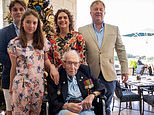 Captain Tom Moore (2-L) with grandson Benji (L), daughter Hannah Ingram-Moore (2-R) and granddaughter Georgia, pictured after completing his 100th length of his garden. A statement from his family tonight read: ‘The last year of our father’s life was nothing short of remarkable. He was rejuvenated and experienced things he’d only ever dreamed of’