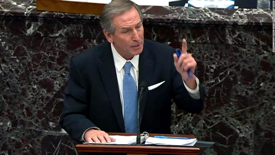 Van der Veen said that the House impeachment managers had not shown “a single example of Mr. Trump urging anyone to engage in violence of any kind.”