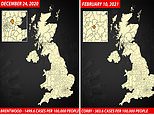 However the infection rate has now fallen by 78 per cent from its highest peak with Corby seeing an infection rate of just 383.6 per 100,000 people on February 10 – 37 days into the third national lockdown.