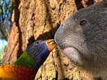 A koala named Luther (right) was ‘kissed’ by a rainbow lorikeet (left) at Mosswood Wildlife Sanctuary in Koroit in south west Victoria on Thursday