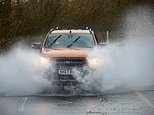 Vehicles cause a splash as they drive through a flooded road in Sutton Gault, Cambridgeshire on Friday afternoon