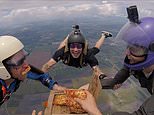 A pizza the action! Skydivers tuck into slices of margherita as they freefall towards the ground from 14,000 feet