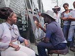 An African American woman gets her portrait painted at Jazz Alley, 50th and Langley, Chicago, Illinois while other people observe the artist