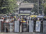 More than 50 protesters have been killed since the coup, according to the United Nations – at least 38 on Wednesday alone in the bloodiest day of the protests so far. Pictured: Protesters stand together with shields during a protest against the military coup on Saturday