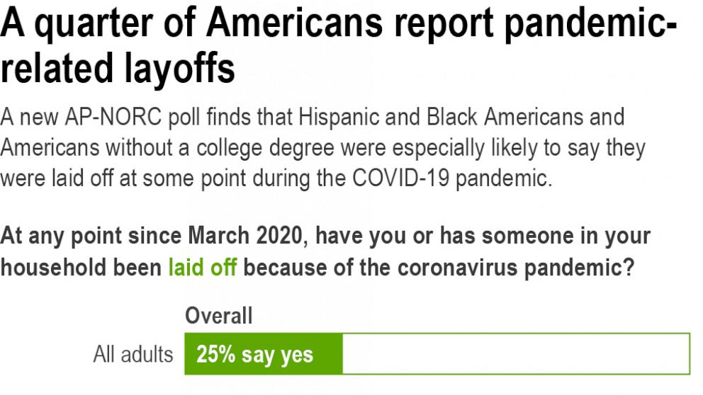 The poll shows that about half of Americans say they have experienced at least one form of household income loss during the pandemic, including 25% who have experienced a household layoff and 31% who say someone in the household was scheduled for fewer hours. Overall, 44% said their household experienced income loss from the pandemic that is still having an impact on their finances.