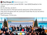 ‘We were a team, and we WON’: Piers Morgan praises GMB stars and crew after show beat BBC Breakfast in rating war for first time on Monday – as more than 50,000 sign petitions to bring him back in 12 HOURS