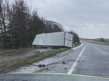 Pictured: An overturned lorry near Cirencester, posted online this morning as Britain endures strong winds across the country