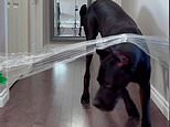 Invisibly confused! Hilarious moment leggy Great Dane decides to slide UNDER cling film barrier even after his owner lowers it