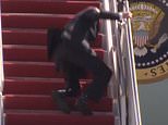 President Biden clings on to the railing as he climbs the steps of Air Force One after stumbling