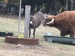 Wallace, an 800kg Highland steer, who weighs twice as much as the miniature donkey was chased off by the smaller animal