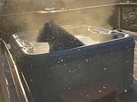 ‘It’s just having a blast’: Astonishing moment wild black bear climbs inside a holidaymaker’s jacuzzi to warm up in the cold mountain air