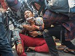 Tens of thousands of people demonstrated in parts of Myanmar today. Pictured: Wounded hand of a protester is seen after security forces intervene in protesters during a protest in Mandalay