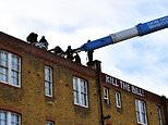 A blue and white crane could also be seen trying to remove demonstrators from the roof of the building, which had been daubed in ‘Kill the Bill’ grafitti and anti-police posters.