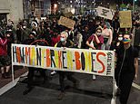 Demonstrators hold placards during the march. Bristol City Council said: ‘Due to this evening’s protest, Park Street, Anchor Road, and Haymarket from St James Barton are currently closed’