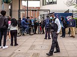 Pictured: Parents and police wait outside the school gates as school children demonstrate in the playground of Pimlico Academy, London and refuse to attend class over racism concerns