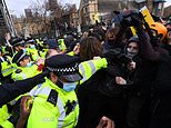 Protestors and police officers pictured in Parliament Square, central London, during today’s Kill the Bill protest. Projectiles were thrown as police pushed protesters away and at least one officer was injured in the scuffle