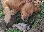 Heartbroken mother dog digs up her dead puppies and refuses to let them go after the tiny animals died during labour
