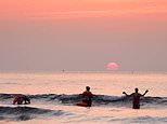 And the sunny weather is expected to last all week with ‘very little rain’ as Britons take advantage of outdoor pubs, bars and restaurants, the Met Office said. Pictured: Women taking in the sunrise in Sunderland
