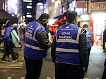 A new legion of Covid Marshals are being employed by councils across England and are expected to take to the streets from July. Pictured: Marshals watch a crowd of revellers in London’s Soho