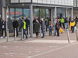 Covid vaccine sites are preparing for floods of patients as health chiefs push to ensure all over-50s are jabbed to tackle the current surge in cases. Pictured: Large queues for outside a vaccine centre in Elgin, Scotland, on Thursday