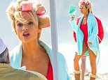 On Friday James was seen wearing hair curlers and a blue terry cloth robe as she looked to film a scene in which Pam exchanges words with the Baywatch director between takes.